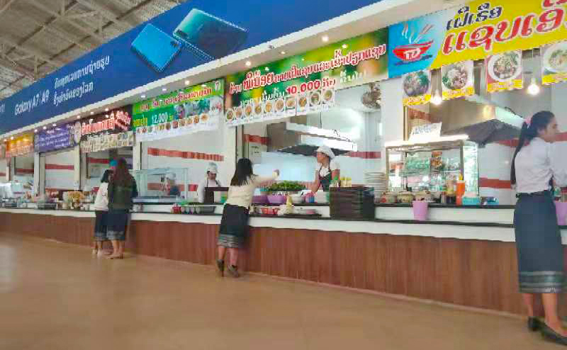 老撾國立大學的食堂帶有很濃郁的東南亞風格,與中國高校的密封式建筑不同,它的四面圍墻基本都以玻璃窗和柱子代替,因此通風和采光都很不錯,食堂里不會充斥著各種食物交雜的悶熱氣息。