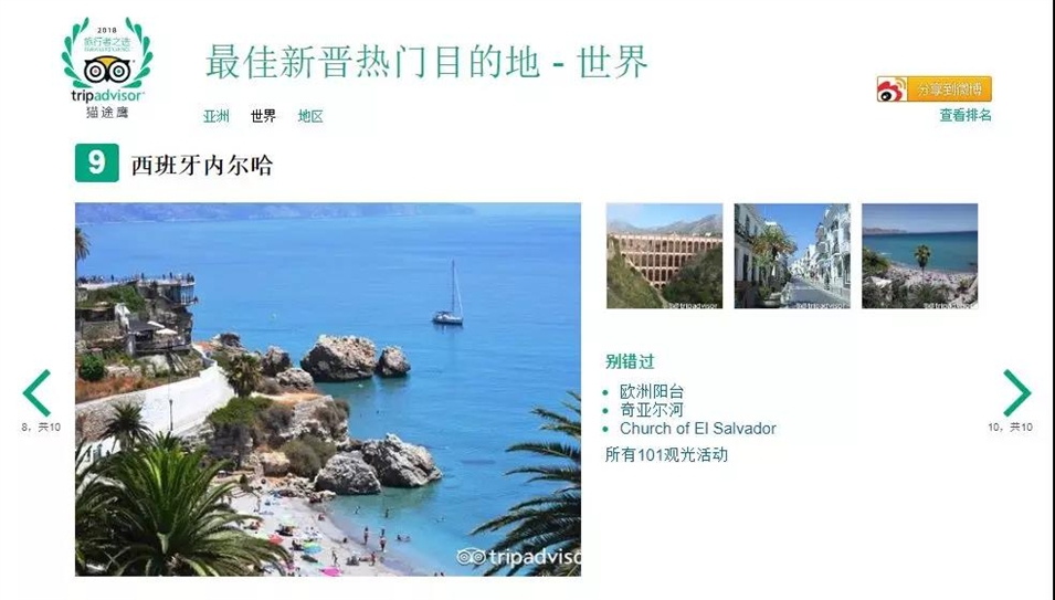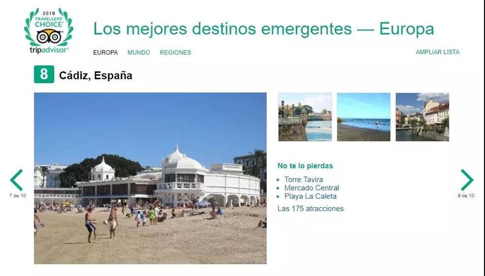 西班牙的兩座城市也分別進(jìn)入了歐洲最佳熱門目的地和世界最熱門旅游目的地榜單:內(nèi)爾哈,位列歐洲第四,世界第九;加的斯,位列歐洲第八。