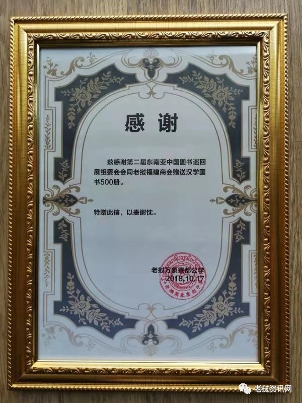 贈(zèng)書(shū)活動(dòng)儀式安排在學(xué)校會(huì)議室舉行,寮都公學(xué)董事長(zhǎng)林俊雄從老撾福建商會(huì)代表們手中接過(guò)由第二屆東南亞中國(guó)圖書(shū)巡回展組及老撾福建商會(huì)共同向竂都公學(xué)捐贈(zèng)的價(jià)值近3萬(wàn)元的圖書(shū)。據(jù)介紹,本次捐贈(zèng)圖書(shū)內(nèi)容涵蓋中國(guó)傳統(tǒng)文化、經(jīng)典文學(xué)、漢語(yǔ)學(xué)習(xí)為主等各類(lèi)圖書(shū)500冊(cè)。交接儀式結(jié)束完畢后,林俊雄董事長(zhǎng)當(dāng)場(chǎng)向老撾福建商會(huì)代表頒發(fā)了受贈(zèng)感謝狀。