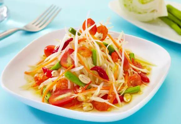 一道味道十分濃烈的沙拉,也是一種深受老撾人喜愛(ài)的涼菜,與一般的水果沙拉不同,青木瓜沙拉的主料為生木瓜,剁切成極細(xì)的絲,用鹽控去苦澀,以魚(yú)露、辣椒、蔥、蒜等舂拌,酸辣香脆,清涼爽口,當(dāng)?shù)厝瞬坏燥垥r(shí)吃,有時(shí)還當(dāng)零食享用,在街邊的小攤上顧客可以自選輔料然后放進(jìn)研缽中搗成沙拉。