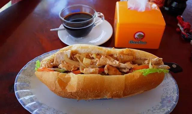 老撾語(yǔ)叫khao ji,之所以在老撾如此常見(jiàn)是跟法國(guó)的殖民歷史密切相關(guān),無(wú)論是餐廳還是路邊攤,法棍隨處可見(jiàn),游客們最?lèi)?ài)的還是將法棍面包切成兩半后夾入一些雞肉、牛肉、火腿、豬肉、雞蛋、蔬菜等不同餡料和醬料,制成三明治,既美味又實(shí)惠。