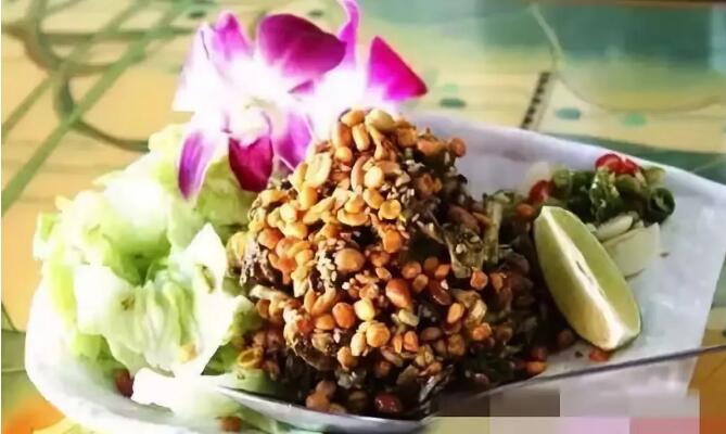 或許緬甸最知名的食物就屬茶葉沙拉了,被稱(chēng)作緬甸的國(guó)菜。大家常把茶葉作為甜點(diǎn)吃,但有時(shí)分茶葉也會(huì)作為茶葉沙拉的質(zhì)料呈現(xiàn)。