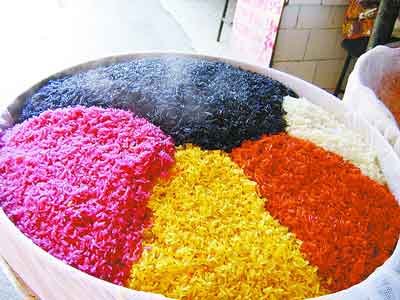 節(jié)前家家戶戶準(zhǔn)備五色糯米飯,人們采來(lái)紅蘭草、黃飯花、楓葉、紫蕃藤,用這些植物的汁浸泡糯米,做成紅、黃、黑、紫、白五色糯米飯。相傳,這種食品是深得仙女們的贊賞后流傳下來(lái)的;也有人說(shuō)是祭祀歌仙劉三姐的。吃了這種飯,人丁興旺,身體健壯。