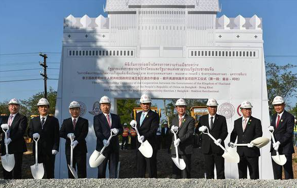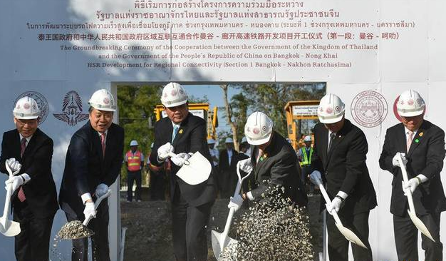 12月21日,泰國總理巴育(左三)與中泰鐵路合作聯(lián)委會(huì)中方主席、國家發(fā)改委副主任王曉濤(左二)等嘉賓們?cè)谔﹪鴸|北部呵叻府巴沖縣舉行的中泰鐵路合作項(xiàng)目一期工程開工儀式上共同鏟土。當(dāng)日,中泰鐵路合作項(xiàng)目一期工程開工儀式在呵叻府巴沖縣舉行。李克強(qiáng)總理向開工儀式發(fā)來賀信。泰國總理巴育親臨現(xiàn)場(chǎng)致辭。中泰鐵路合作聯(lián)委會(huì)中方主席、國家發(fā)改委副主任王曉濤、中國駐泰國大使呂健,泰國交通部長阿空、內(nèi)政部長阿努蓬,以及來自中泰政府部門、鐵路管理部門、相關(guān)企業(yè)、媒體等近400人出席開工儀式。新華社記者李芒茫攝